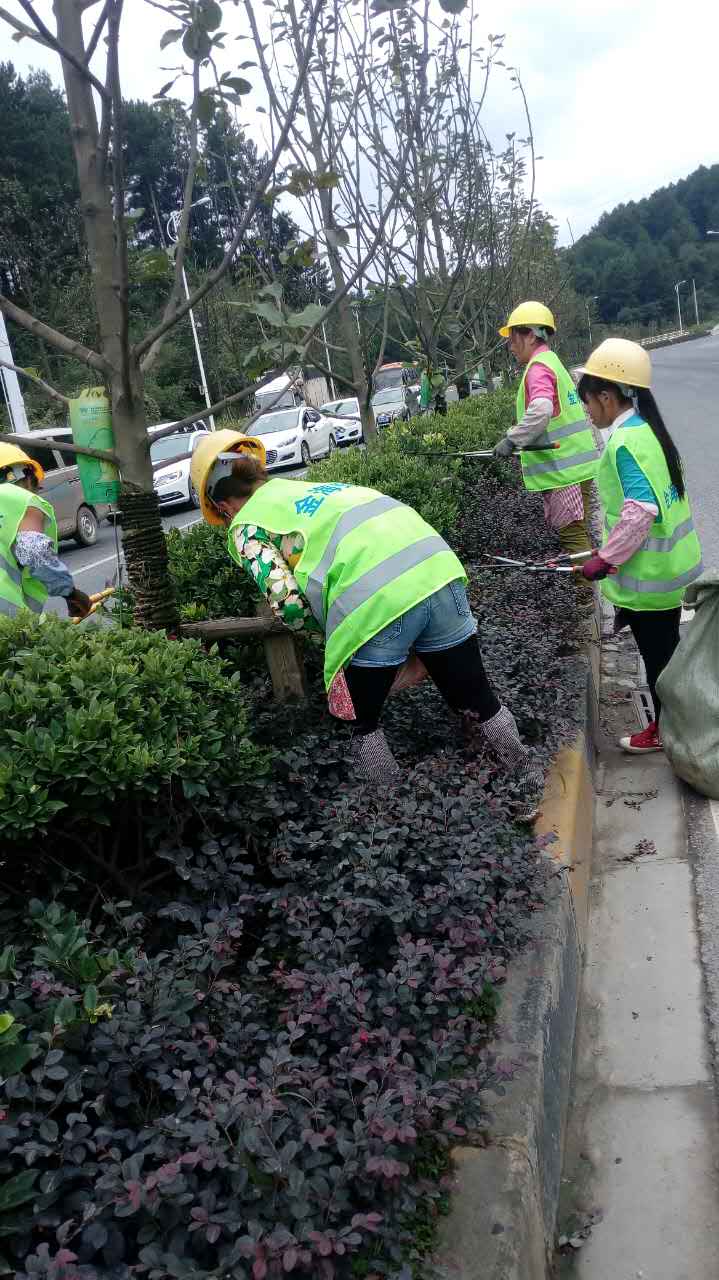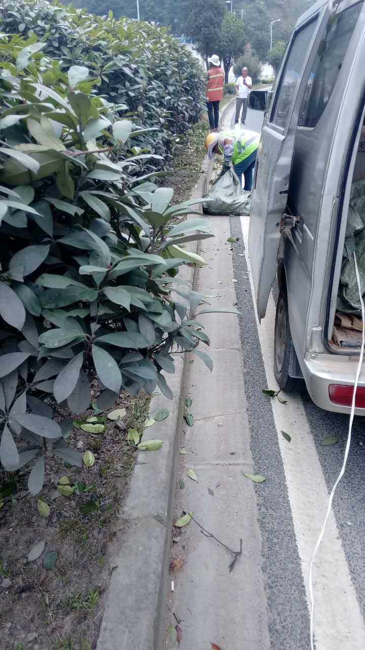 南二環中央綠化帶修枝剪葉綠化環境維護工作正在進行中,圖為金海綠化養護隊工作中。